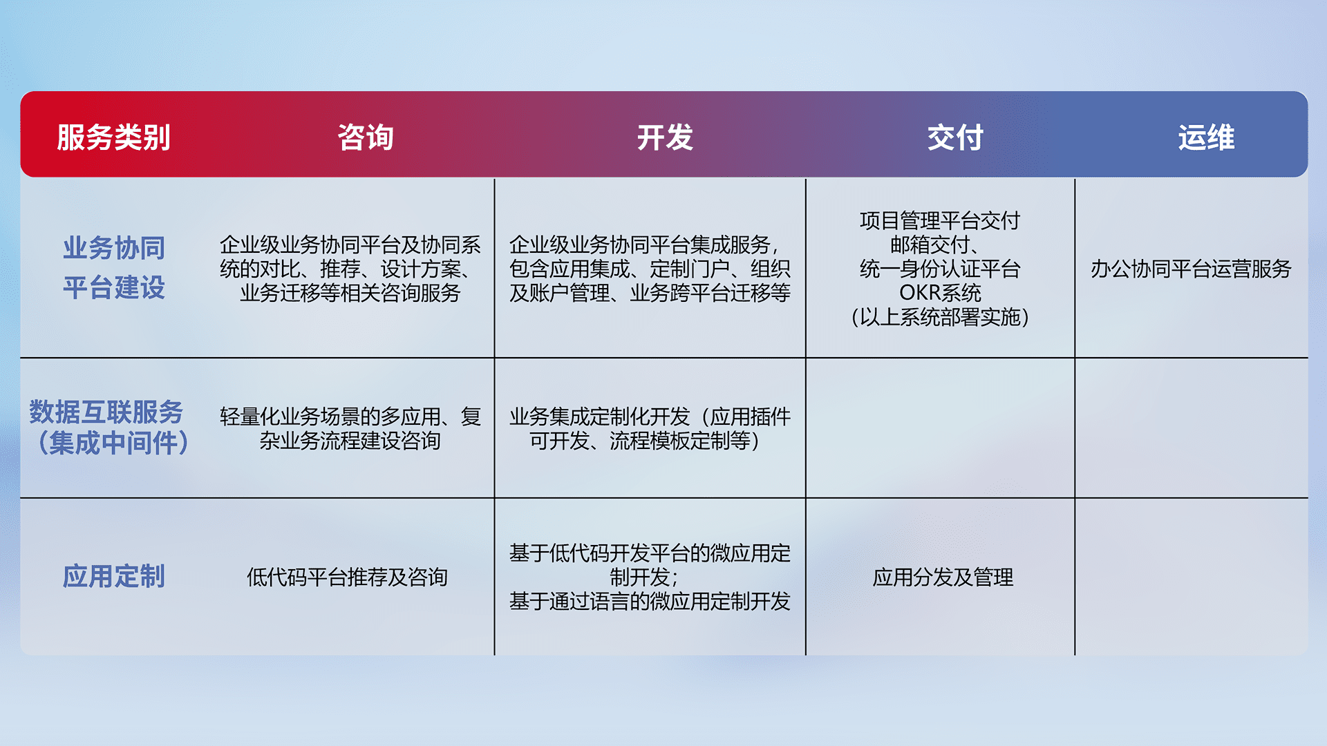 针对钉钉、、、企微、、IDaas等平台级产品提供产品的规划、、、方案、、、交付、、、、定制化开发等服务,,实现如统一协同办公、、、、智能客户服务、、混合会议管理、、、、智能数据查询、、、等业务场景,,实现数字化转型。。。。